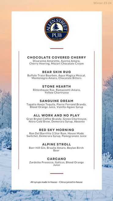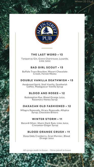Starting in 2022, we starting down our journey to develop a cocktail program that is fun and approachable. We have a liquor collection that surpasses any establishment in town. We juice citrus, and make all our syrups in house. We make an effort to include local spirits, and when the weather warms in Albany we use local fruits and herbs. As of 2025 we have two house-made nitro infused draft cocktails available.